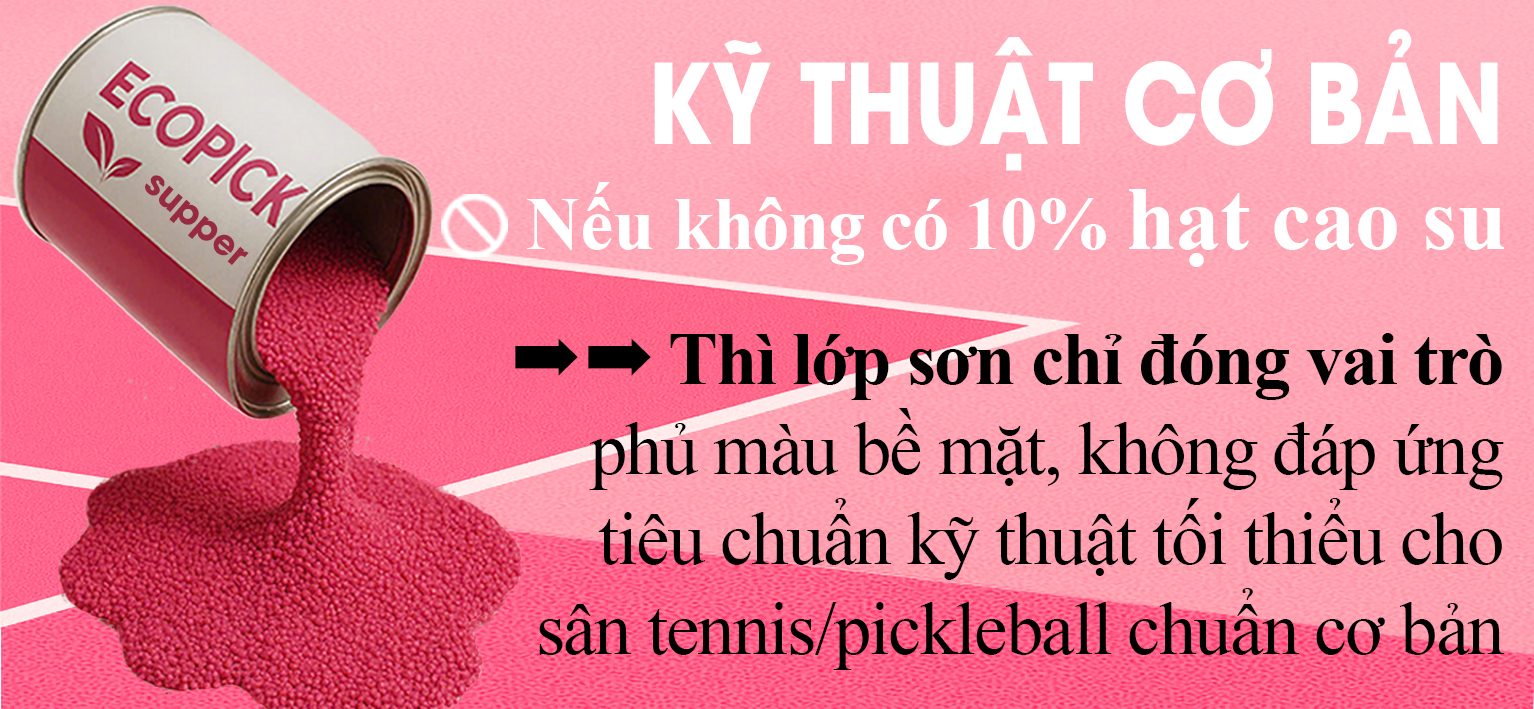 Tiêu chuẩn quốc tế (US Open, ITF, IFP) sơn sân chuẩn bắt buộc lớp giảm chấn phải chứa 8–15% hạt cao su để đảm bảo độ nảy banh chuẩn